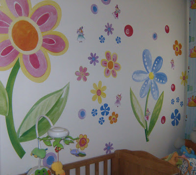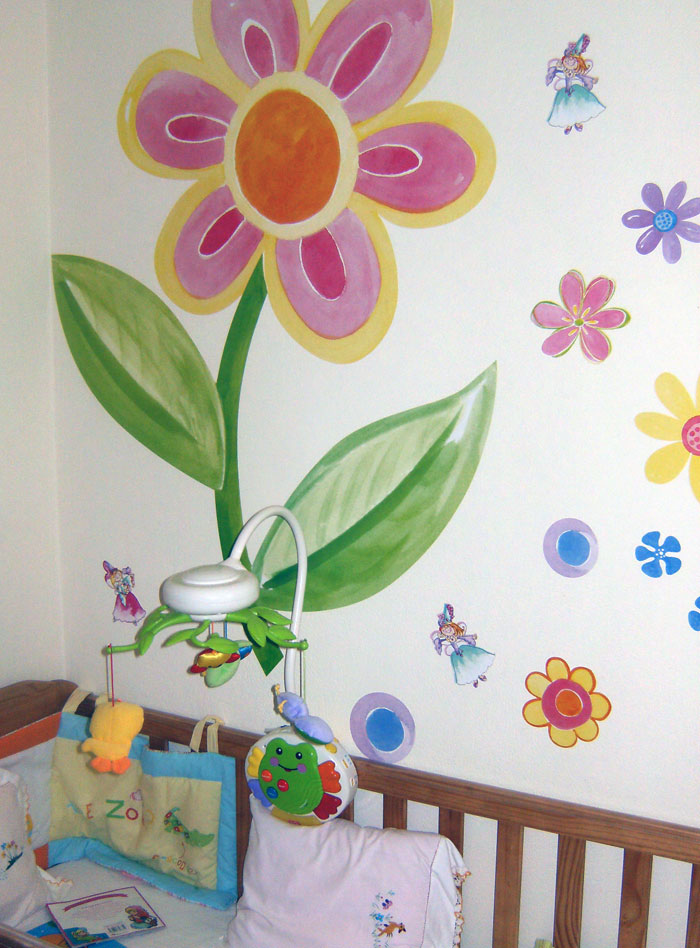 «Είπα να σου στείλω και εγώ φωτογραφίες από το δωμάτιό μας, γιατί έχουμε χρησιμοποιήσει κάποια αυτοκόλλητα, τα οποία μοιάζουν με ζωγραφική! Δεν ξέρω αν στις φωτογραφίες φαίνονται καλά, πάντως όλοι με ρωτάνε αν το έχω ζωγραφίσει! Την 40η βδομάδα και αφού είχα βαρεθεί να περιμένω και δεν έβγαινε με τίποτα, αποφάσισα να φτιάξω το δωμάτιό της. Μου έλεγαν ότι είναι γρουσουζιά να το φτιάξω πιο πριν και άλλες τέτοιες βλακείες. Μου την έδωσε, λοιπόν και εμένα και πήρα αυτά τα όμορφα λουλουδάκια, περισσότερο για να φτιάξω τη διάθεσή μου!