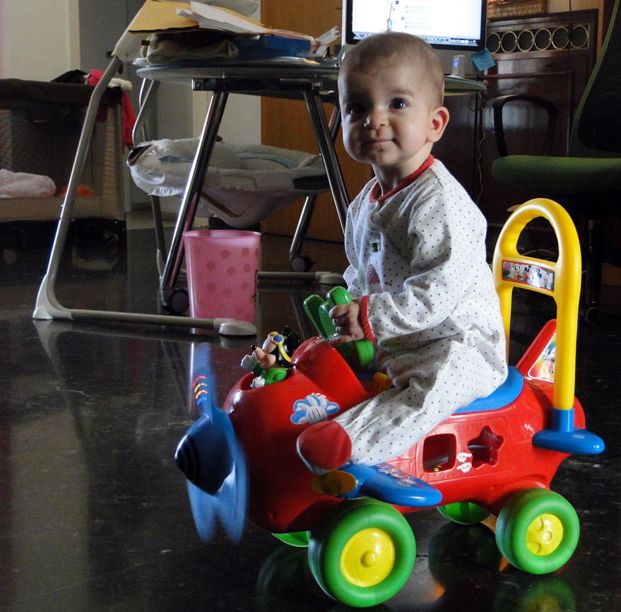 Ε λοιπόν, μετά από 3 βδομάδες χρήσης, μπορώ να σας πω άπειρα θετικά και μόνο ένα τόσο δα μικρό αρνητικό. Καταρχάς σύμφωνα με τη συσκευασία το παιχνίδι είναι για παιδάκια από 12 μέχρι 36 μηνών. Η Αθηνά άρχισε να το χρησιμοποιεί από 9 μηνών, φυσικά με τη βοήθειά μας, μιας και τα ποδαράκια της δεν φτάνουν ακόμα να πατήσουν στο πάτωμα όταν κάθεται πάνω στο αεροπλάνο.