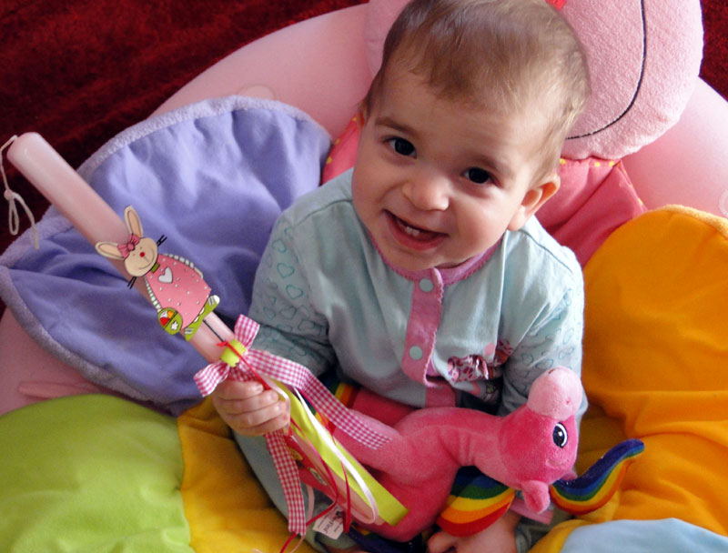 Χθες ήρθε ο νονός Φίλιππος και έφερε στην Αθηνά την πρώτη της λαμπάδα! Είναι το δεύτερο Πάσχα της ζωής της, αλλά πέρσι δεν είχε βαφτιστεί και έτσι λαμπάδα δεν είχε!