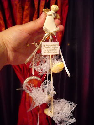 Η Άννα έφτιαξε τις μπομπονιέρες, τα μαρτυρικά, τη λαμπάδα, το μπουκάλι για το λάδι και τα κεράκια! Οι φωτογραφίες μιλούν από μόνες τους! Τα αγγελάκια είναι ένα πολύ όμορφο θέμα με πολλές πολλές επιλογές!