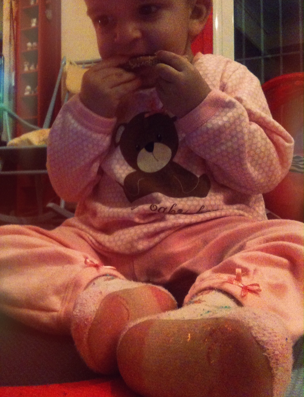 Να και μια φωτογραφία με την Αθηνά να τρώει κριτσίνι, ενώ φοράει σούπερ αντι-ολισθητικές καλτσοπαντόφλες τέτοιου τύπου!
