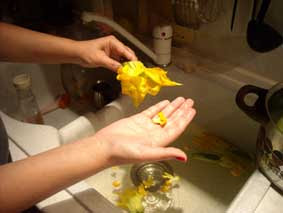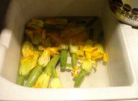 Γεμίζουμε τον νεροχύτη με νερό και αλάτι και ρίχνουμε μέσα τα κολοκυθολούλουδα. Το αλάτι θα κάνει τα ζουζούνια (αν υπάρχουν) να τρέξουν να σωθούν και το νερό θα ανοίξει τα λουλούδια ώστε να είναι εύκολο το γέμισμα.